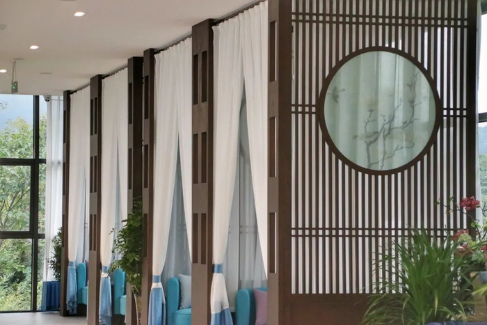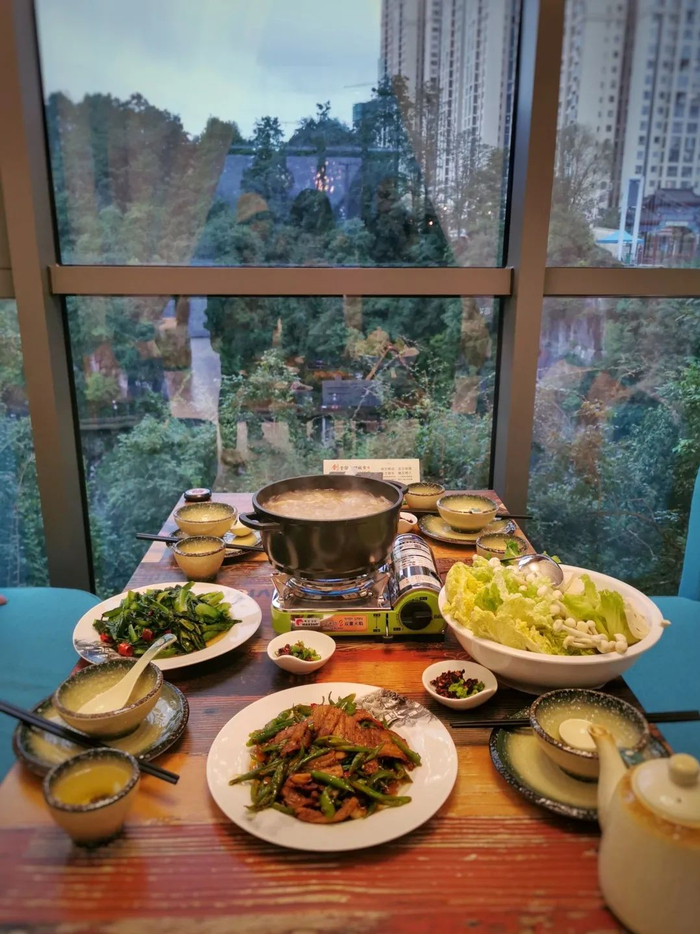 南卓悬崖餐厅临崖壁而建,垂直高度近百米,树荫环绕,抬眼即可欣赏到洒金谷自然风光。