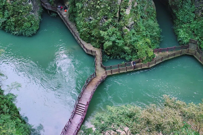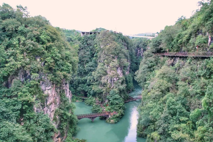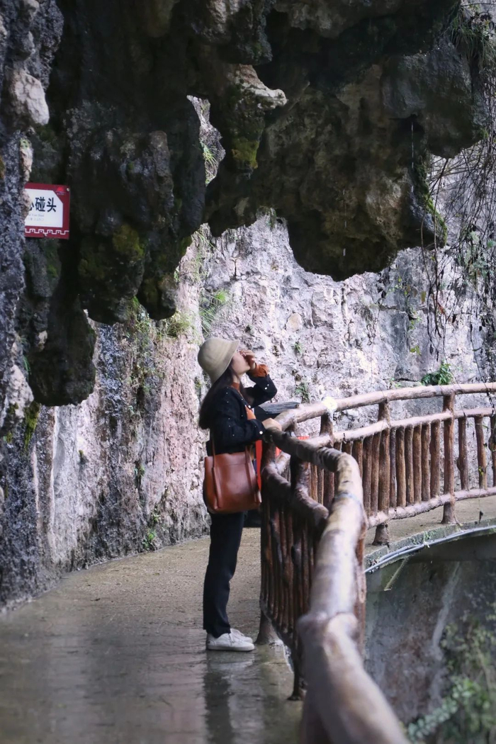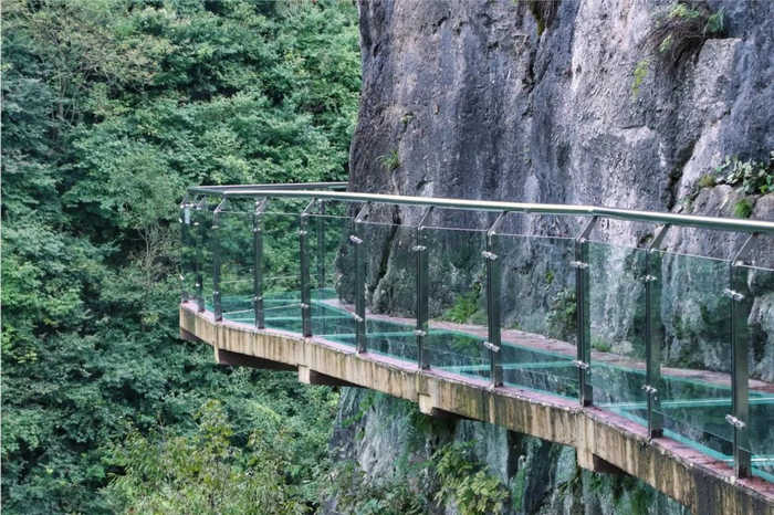 景区玻璃栈道不是很长,但是当谷底急流配合着5D声效时,还是会让人禁不住腿软。如果你实在感到害怕,可以靠向山体行走,里面有一小部分是水泥材质,安全感会更高一些。