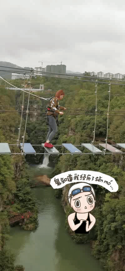 步步惊心桥悬挂在河谷上方的百米高空,中间踏板由颜色不同的钢化玻璃组成,看河水从脚下流过,那感觉简直胆战心惊。