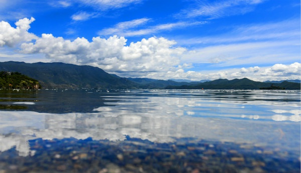 图说:美丽的泸沽湖倒映着蓝天白云。