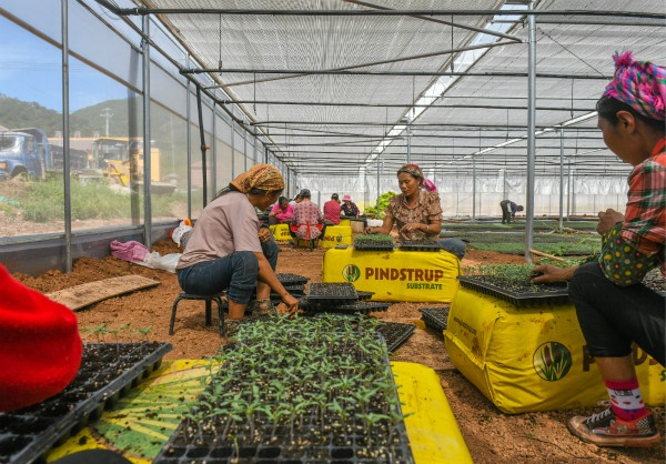 午后,外面大约26摄氏度,艳阳高照。高原的日照非常强烈,太阳特别毒,晒在身上火辣辣的,宁蒗当地人戏称“因为离太阳近”。一钻进大兴镇拉都河村蔬菜产业基地的大棚,就是另外一种感受。棚里闷热潮湿,工人们正在移栽番茄秧。这片蔬菜产业基地有350亩,大棚一个连着一个,很是壮观。