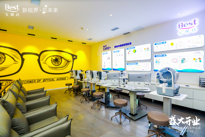 10月10日上午,在各界名流嘉宾、KOL、VIP用户及各方媒体的见证下,宝视达兰德中心店正式开门迎客,色彩靓丽、身型巨大的“眼镜之门”,充满地标风范,未来感十足的迎接着八方来客。在现场,我们可以看到,旗舰店分为两层,一楼以太阳镜和隐形眼镜、美瞳产品为主,小而美的气质,少而精的陈设,十分清新简约;进入二楼,才真正触达宝视达旗舰店级别的核心魅力:投入接近200万的专业设备,从七合一WAM700黑科技验光,到眼底AI人工智能筛查仪,再到为儿童视力检测准备的生物测量仪,硬件实力瞬间秒杀无数小店;一名视光师一个专属工作间,每位消费者都可享有的VIP私有配镜空间,比肩国家认证高级验光师的医疗级视光团队阵容,每一个顶流配备,都让人忍不住打CALL;而人手一份的宝视达视力健康档案、一对一的定制化视力解决方案,则更让人深刻感受宝视达的匠心精神的同时,对其极致的服务念念不忘。