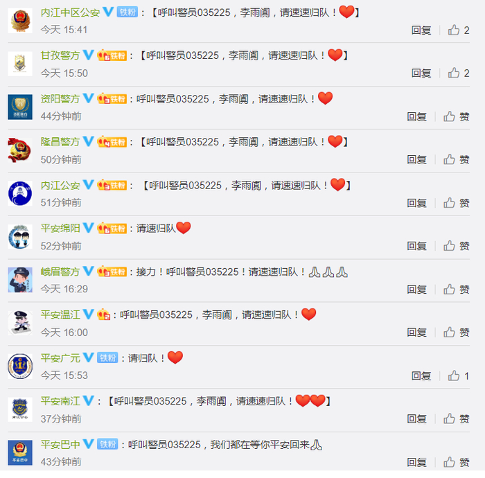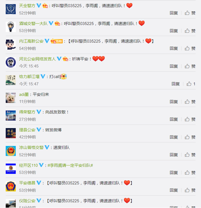 李雨阗的失联,时刻牵动着当地群众和万千网友的心,“警号035225,李雨阗,请速平安归队!”