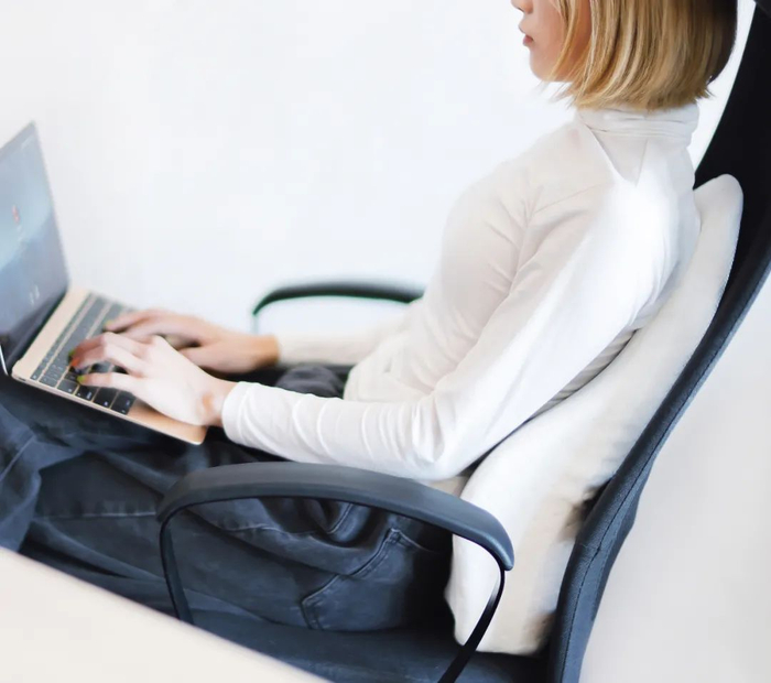 靠上去的一瞬间,感觉整个上半身的曲线非常舒服地贴合到腰靠上,整个后背都非常放松。这种感觉就像有一双手,从后背的上方一直按到尾骨。