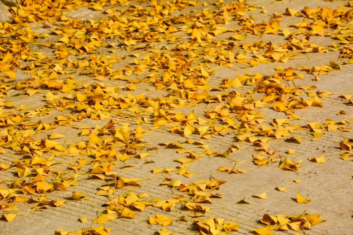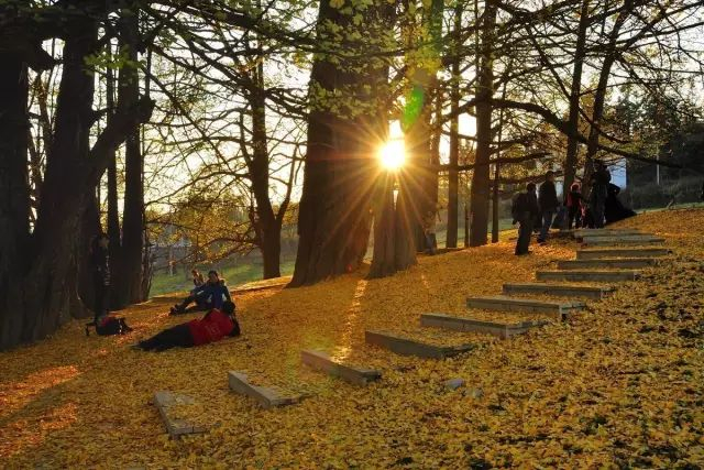 等了一年,银杏树下的地面终于换上了新衣,被金黄的银杏树叶覆盖,步梯上也如此。