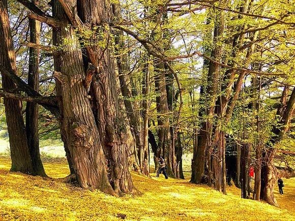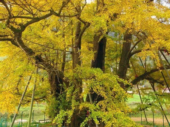 这棵树的一代树已经死去,树木成中空状态,而外围是二代树。每年这个时候,树下一片金黄落叶,美得不可思议。