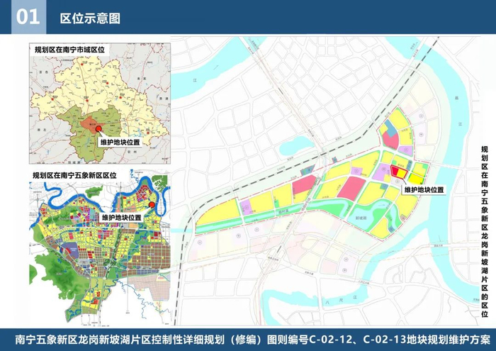 本次维护图则编号C-02-12、C-02-13地块位于南宁市五象新区龙岗片区东部,即在新坡路以南、和合路以西、23号路以东、颜村路以北的围合区域中,C-02-12、C-02-13维护地块总用地面积为34860平方米,折合52.29亩。