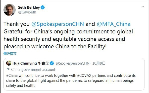 全球疫苗免疫联盟首席执行官伯克利10月9日特意转发了华春莹有关中国加入的推特,并表示:“谢谢你,华春莹和中国外交部。感谢中国对全球健康安全和公平获得疫苗的持续承诺,欢迎中国加入机构!”