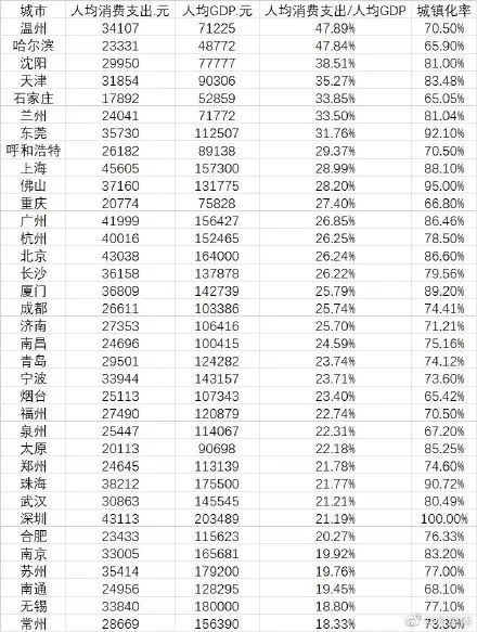 在人均消费率方面,温州居榜首,位列前茅的主要是北方城市,兰州排在第6。根据该榜单,兰州人均消费支出为24041元,人均GDP为71772元,人均消费率为33.50%。