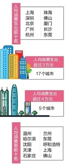 在人均消费支出方面,前十名的城市分别是上海、深圳、北京、广州、杭州、珠海、佛山、厦门、长沙和东莞,以南方城市为主;在人均消费率方面,温州居榜首,而位列前茅的主要是北方城市。