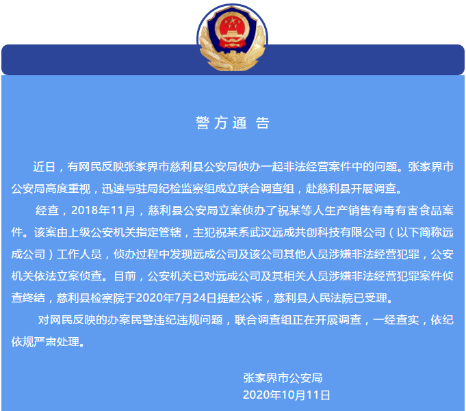 10月11日,湖南省张家界市公安局微信公众号发布情况通报:近日,有网民反映张家界市慈利县公安局侦办一起非法经营案件中的问题。张家界市公安局高度重视,迅速与驻局纪检监察组成立联合调查组,赴慈利县开展调查。
