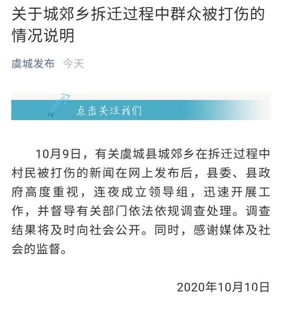 今天上午,虞城县政府通过官方微信公众号“虞城发布”对外发布公告称,已关注城郊乡执法人员拆迁过程中伤民事件,“连夜成立领导组,迅速开展工作,调查结果将及时向社会公开”。