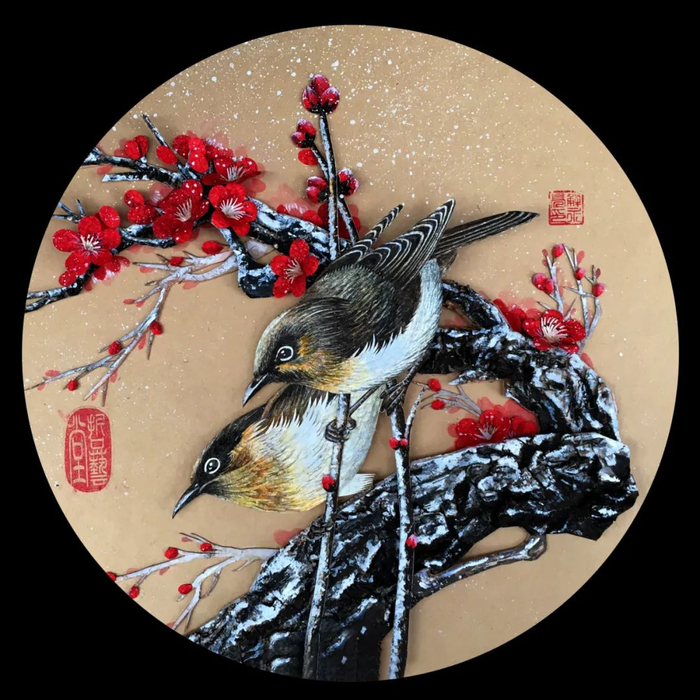 解永亮结合美术专业知识,将多种艺术手段交叉相融,开创浮雕、手绣、染色、防腐等多种鱼皮加工工艺。在他的鱼皮画廊里,巨幅东北虎融入现代工笔画元素,威风凛凛,根根毛须清晰可见;手绣牡丹每朵花瓣里都放置填充物,显得精致立体、丰盈饱满;经染色处理,两只蓝色鸟儿站在红色花枝上互相依偎,明艳而不失典雅……伴随赫哲族旅游业发展,鱼皮画被越来越多游客喜爱。