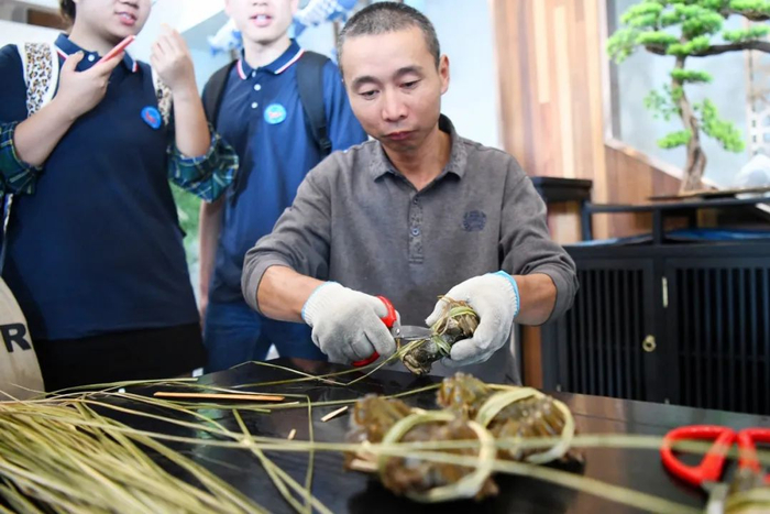 市场上现在捆扎大闸蟹一般都在使用绳子,而崇明大闸蟹依旧使用稻草进行捆扎