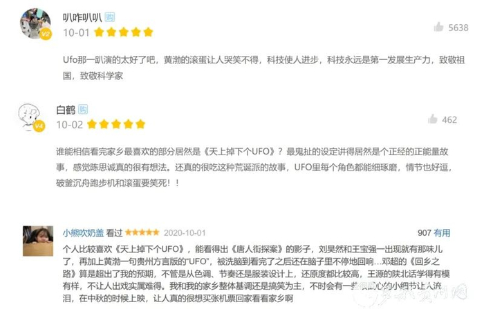 除了票房持续上涨外,影片也获得了观众们一致好评,不仅大众评分高达9.3,更有网友观影后打出“国庆档最好看的一部电影”“值得一看”“最好的献礼片之一”等五星好评。其中,贵州故事单元《天下掉下个UFO》也引起了众多网友热评。