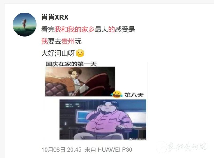 镜头中呈现出的贵州风土人情,也吸引着不少影迷“恨不得立马背上行囊就出发”。“看完《我和我的家乡》最大的感受是:我要去贵州玩,大好山河呀!”网友“肖肖XRX”评论道。