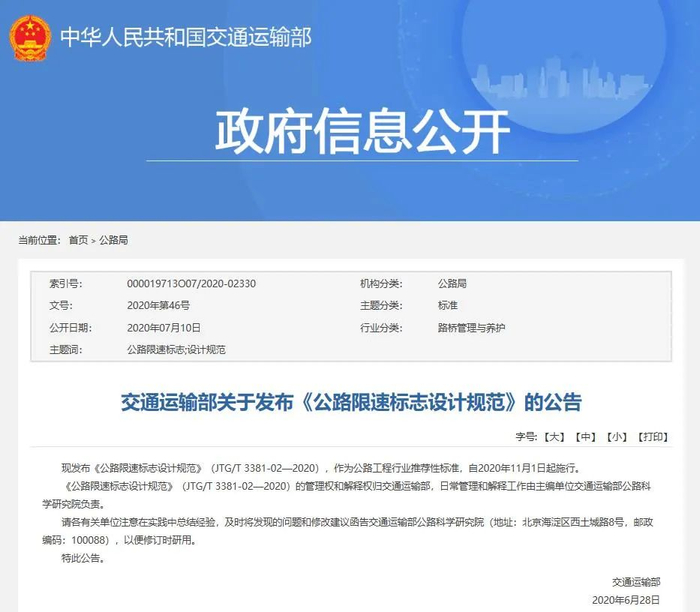 对此,交通运输部在近日发布了《公路限速标志设计规范》公告,将进一步规范全国限速标志设计,自2020年11月1日起施行,大量不合理的限速标志将会面临拆除。