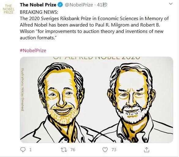 当地时间10月12日中午,瑞典皇家科学院将2020年诺贝尔经济学奖授予保罗·米尔格罗姆(Paul R. Milgrom)和罗伯特·威尔逊 (Robert B. Wilson),以表彰他们“对拍卖理论的改进和新拍卖形式的发明”。(图片来源:诺贝尔奖官方社交账号截图)