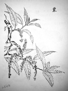 单就说实指本体,提到栗的诗篇也有不少。早前老是念叨的《鄘风·定之方中》,就有“树之榛栗,椅桐梓漆”之句。说起来,作为常见的落叶乔木,栗子树本身的材质不错,用潘富俊老师的研究来说,“边心材不明显”,就是剥了皮就能用,内外如一,不像黄花梨、小叶紫檀之类的硬木,看起来高高壮壮,心材有时候也就指头粗。生长均匀,纹理直,又耐水湿,算是硬杂木的一种,栋梁、椽檩常有使用。据说,树皮还富含单宁,可用于皮革鞣制。所以,盖房子求吉祥的“咒语”,《定之方中》,把六种良材放在一处,用来宣示精工匠心。
