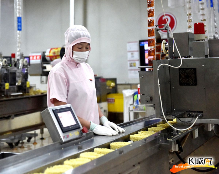 今麦郎集团袋装方便面车间员工在生产线上忙碌。