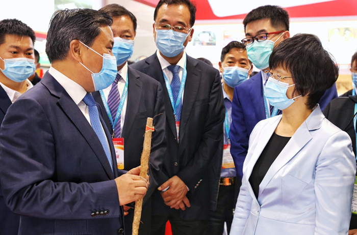 ▲ 10月11日,河南省在沪举办优质特色农产品(上海)展览会活动,河南省副省长武国定(左)在活动期间向上海市副市长宗明(右)介绍河南农产品,拼多多副总裁狄拉克(右二)等在沪企业代表陪同参加此次豫沪农业领域合作对接活动。(摄影 安舜)
