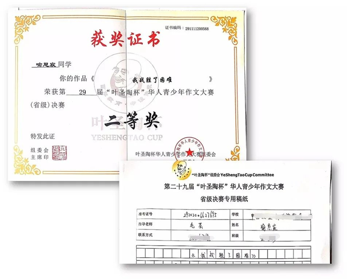 思宸同学在叶圣陶杯大赛中获奖