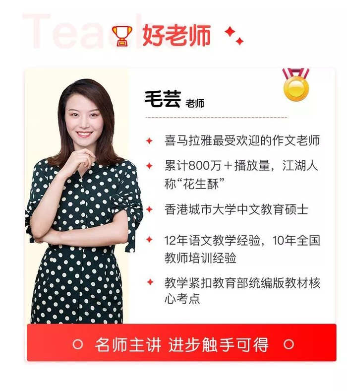 而在作文领域,最让笔者佩服的老师就是毕业于香港城市大学的花生酥老师—毛芸。