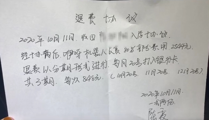 咿呀机器人机构负责人说,为了不让王惠娟蒙受损失、继续为退费事宜费周折,咿呀机器人培训机构愿意预先垫付、退还这笔课程的费用,而后再与大森林教育综合体继续结算相关债务。