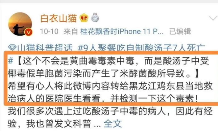 事实上,这则消息出来后,就有多位网友和医药健康界专家陆续表示质疑,认为黄曲霉素可能是背锅侠,真正致死的罪魁祸首极有可能是米酵菌酸。