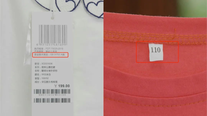 在挑选童装时,专家建议宝妈们一定要先看准正规品牌童装。一般,正规厂家生产的童装都包含了三标:吊牌、领标、水洗标。宝妈们在这三标上可以看到衣服的品名、货号、面料、安全级别、洗涤方法等详细信息。比如这两件童装,一件是三标齐全的正规童装,另一件就只标了码数,很明显信息就不齐全。