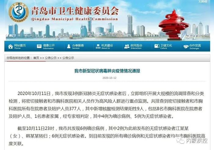 10月12日,青岛市卫生健康委官方通报,新增新型冠状病毒核酸检测结果阳性12人,其中6例为确诊病例,6例为无症状感染者。鉴于当前国际疫情持续扩散和秋冬季疫情反弹风险较大的实际,为精准做好我市疫情防控工作,加强监测预警,现就有关事宜通告如下: