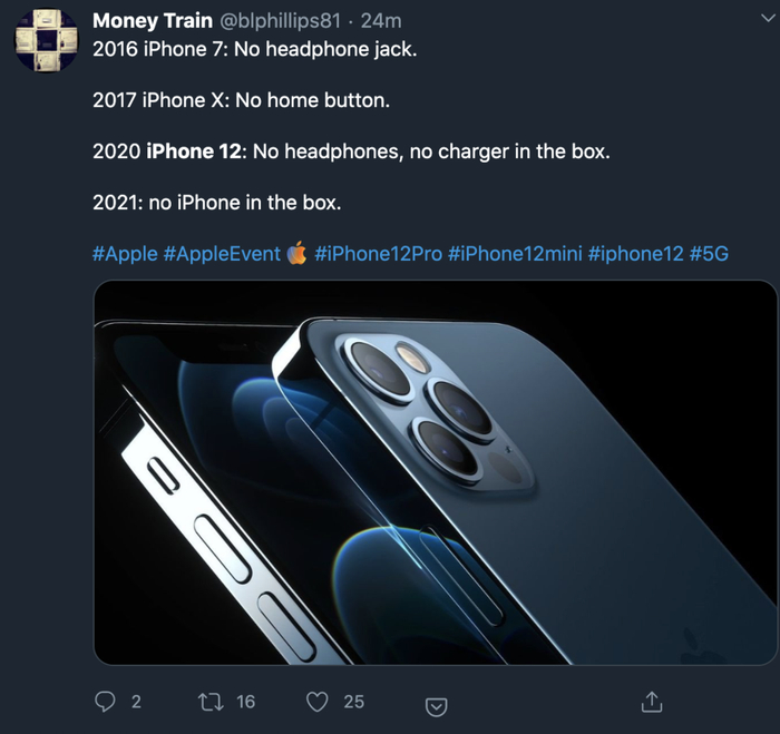 一位网友表示,2016年iPhone 7取消耳机接口、2017年iPhone X取消Home键,2020年iPhone 12盒子里没有耳机和充电器,2021年盒子里没有iPhone。