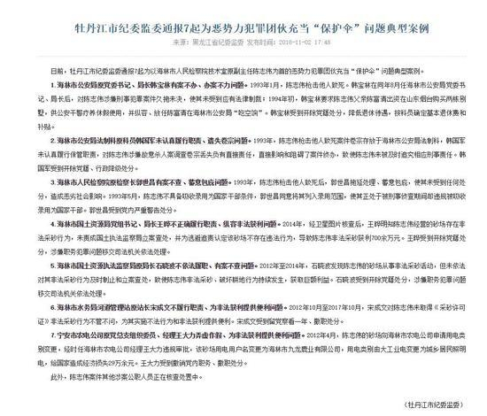 牡丹江市纪委监委通报多名领导干部为陈志伟充当“保护伞”的案例 图据牡丹江市纪委监委