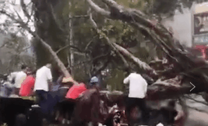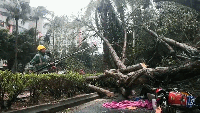 10月13日下午,大同路香港城路段一棵大榕树被狂风掠倒,采购防风物资的龙华区中山街道办西湖社区居委会工作人员潘绿茵,骑车路过时被倒塌的榕树砸伤。事发后,民警和热心群众合力将潘绿茵救出,抬上救护车送往海南医学院第一附属医院救治。