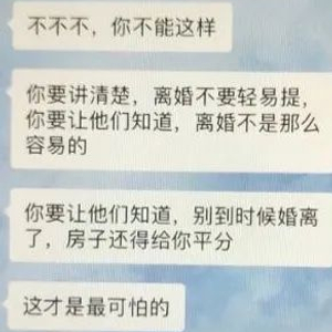 主要还是聊房子的事,她小姐妹劝她不要轻易离婚,目的是让我家里人知道,我老婆一定要拿走一半的房子,想离婚没有那么容易。结果,我老婆一点也不反驳,还说,等我房上加了她的名字,她就要跟我离婚。