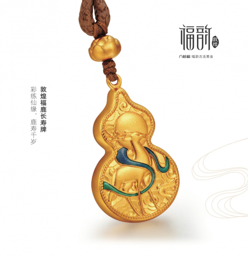 系列新品“敦煌福鹿长寿牌”将敦煌九色鹿、飞天元素与葫芦形象相结合,飞天的漫天飘舞的飘带环绕九色鹿,并以珐琅工艺在飘带上形成艺术色彩,显得独特时尚,使敦煌传统元素具有了现代审美,富有装饰性。