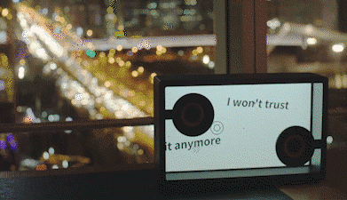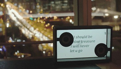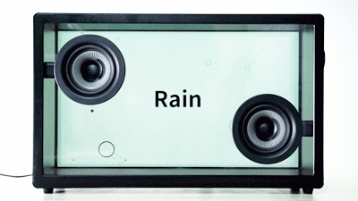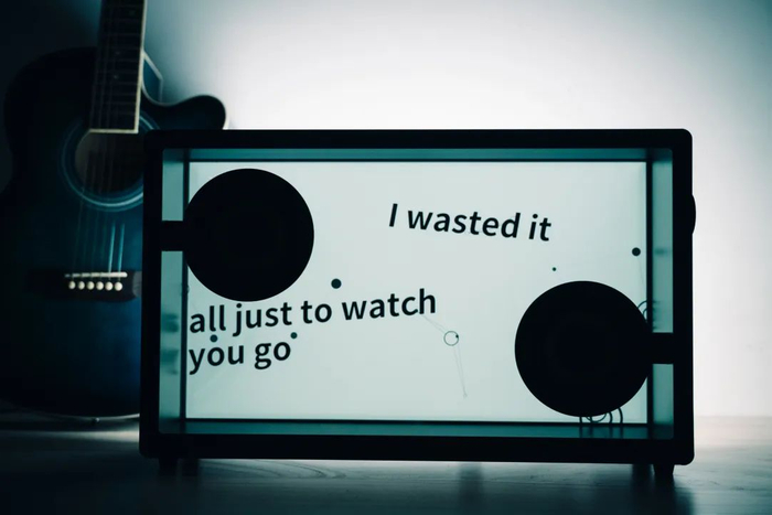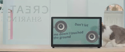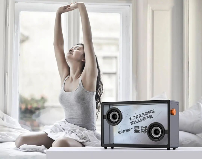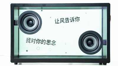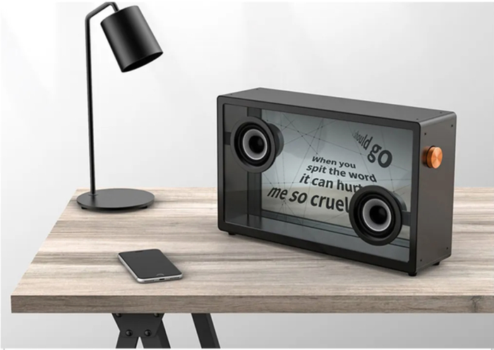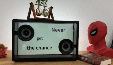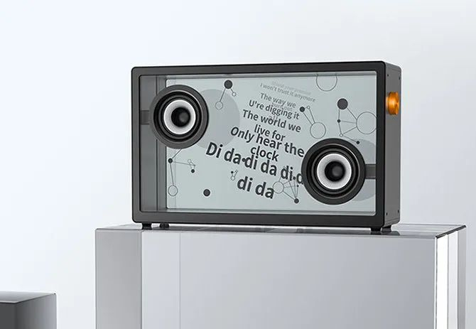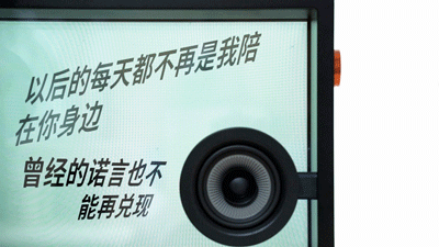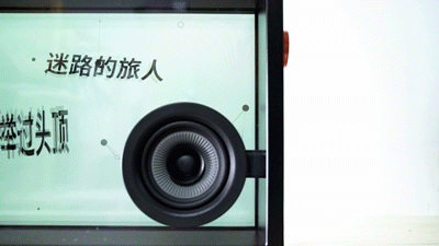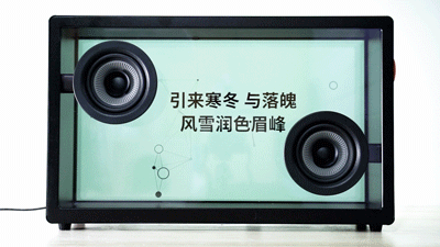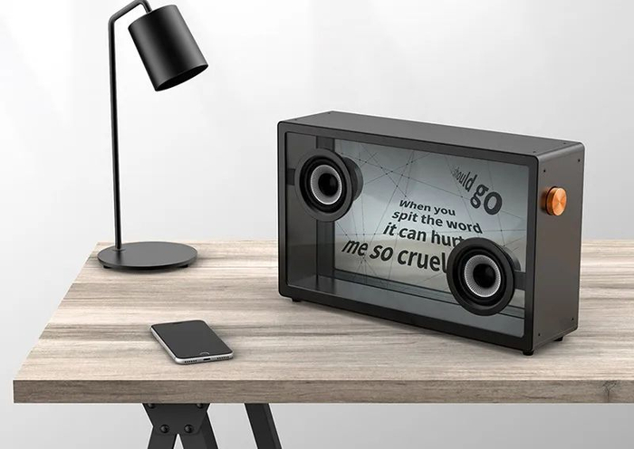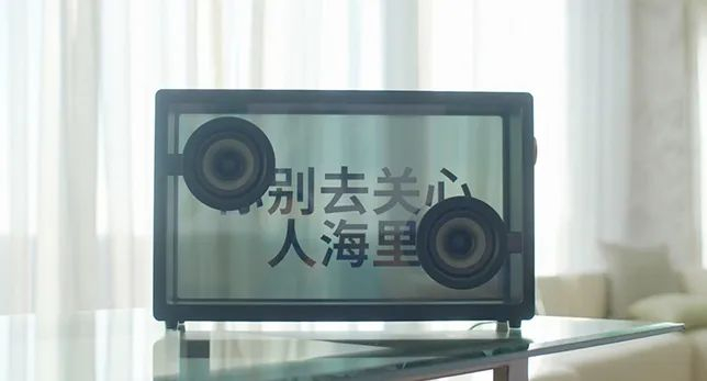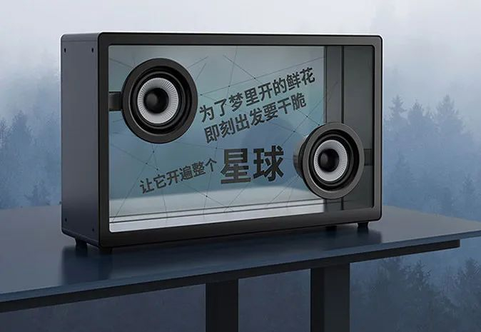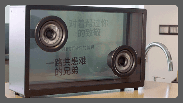 音箱的显示屏以及前后面板都呈现出透明感,让歌词看起来好像是悬浮在空中一样。