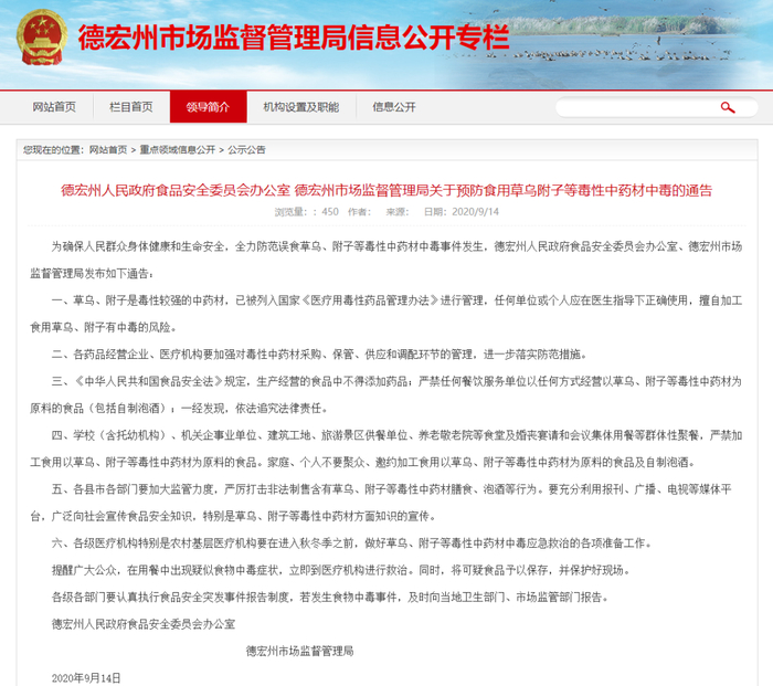 9月14号,德宏州市场监督管理局官网发布了关于预防食用草乌、附子等毒性中药材中毒的通告,特别提醒单位和个人,要在医生指导下正确食用草乌类植物。