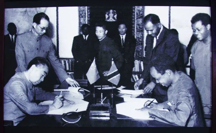 1965年6月8日周总理和尼雷尔在达累斯萨拉姆签署联合公报