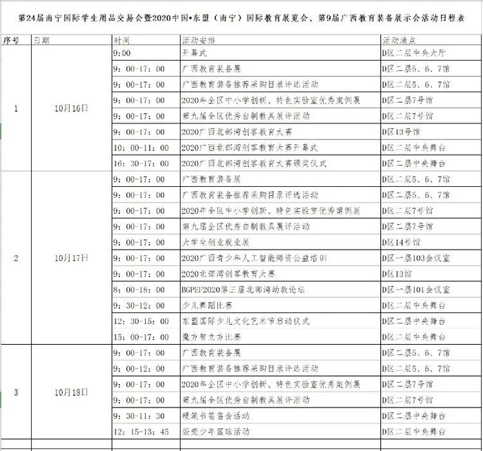 第24届南宁国际学生用品交易会暨2020中国·东盟(南宁)国际教育展览会、第9届广西教育装备展示会活动日程表:
