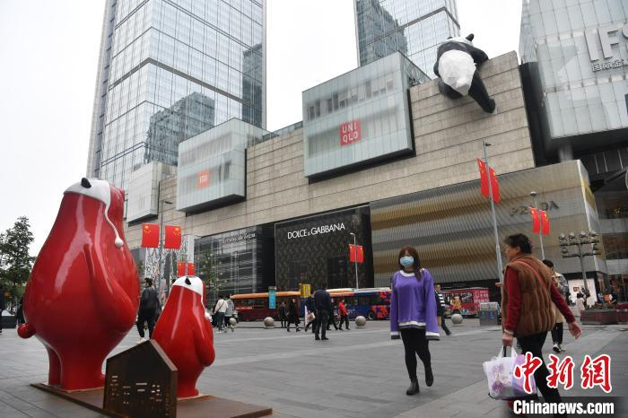 10月15日,成都红星路步行广场新落成的一只大熊猫雕塑和两只黑熊雕塑引人注目。该雕塑与对面IFS楼顶的“爬墙大熊猫”相望。随着新雕塑的落成,“爬墙大熊猫”也迎来了3位邻居。