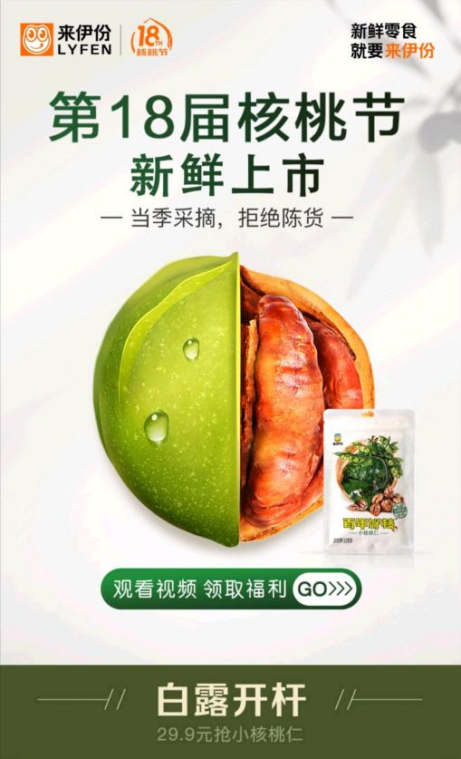 当下正是新鲜核桃全面上市的季节,今年来伊份核桃节以“当季鲜上市”作为主题,凸显来伊份在“新鲜零食战略”执行中的品牌自信,以百年好核小核桃仁为主打的明星产品,严格优选大核原果,并在原产地完成一系列一体化的加工流程后,使其拥有了“当季新采,酥脆鲜香”的特点,在消费者中广受好评,也是来伊份“十大单品”之一。