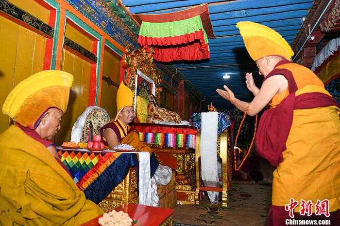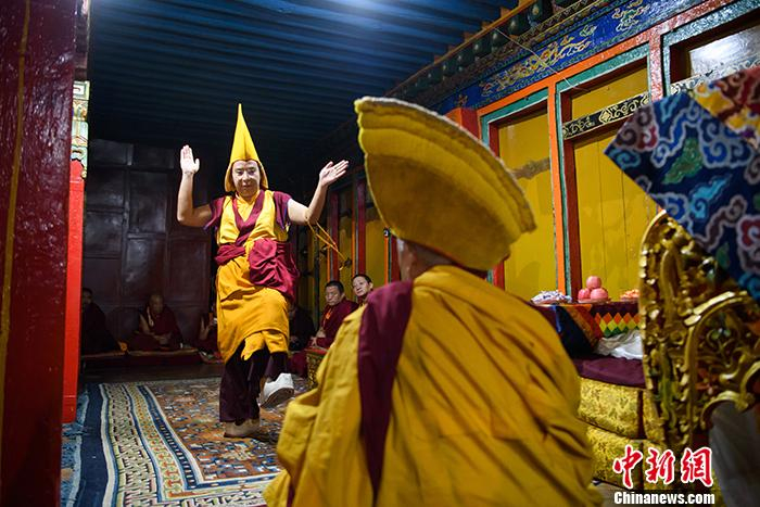 10月6日,在扎什伦布寺高级辩经现场,十一世班禅与高僧进行辩经。中新社记者 何蓬磊 摄