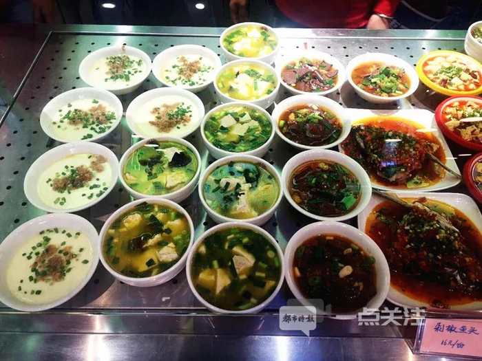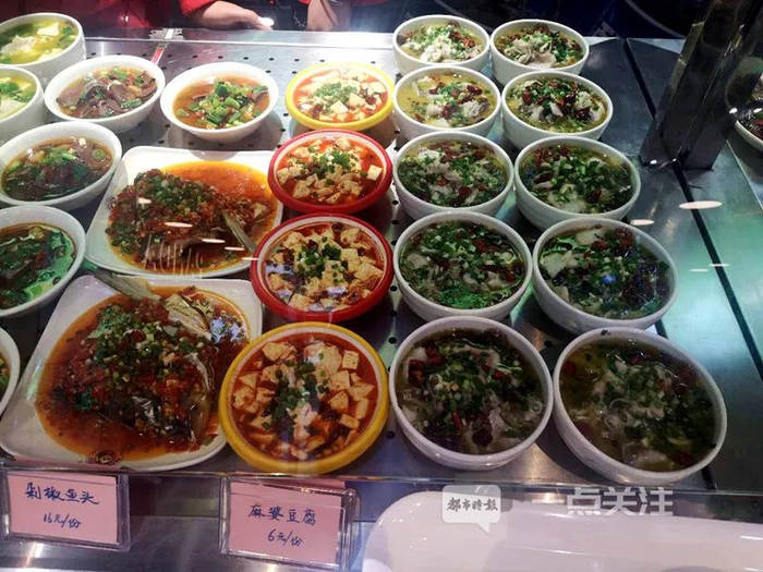 都市时报一点关注记者发现,展柜里菜品和美国的熊猫餐厅的六个菜相比是挺多的,菜品上当然也少不了熊猫餐厅在美国市场大受欢迎的招牌菜宫保鸡丁和陈皮鸡,除此之外还有剁椒鱼头、麻婆豆腐、鱼香茄子、西蓝花炒牛肉、红烧狮子头等。时蔬价格为6元一份,荤菜在12元到16元不等。