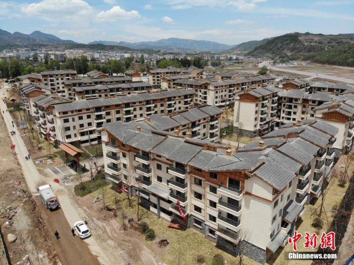 资料图:5月13日,四川省凉山州昭觉县支尔莫乡阿土列尔村31户村民带着行李通过钢梯下山,集中搬迁至昭觉县易地扶贫搬迁县城集中安置点的新家。图为航拍昭觉县易地扶贫搬迁县城集中安置点,“悬崖村”村民新家位于此地。 张浪 摄