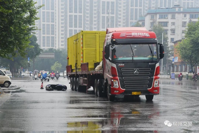 柳州市公安局交警支队柳南大队接到报警,在柳州市西环路与河西路路口发生一起重型半挂牵引车与电动车发生碰撞,两车不同程度损坏,电动车驾驶人卢某受伤的事故。