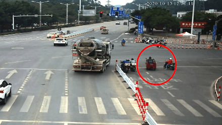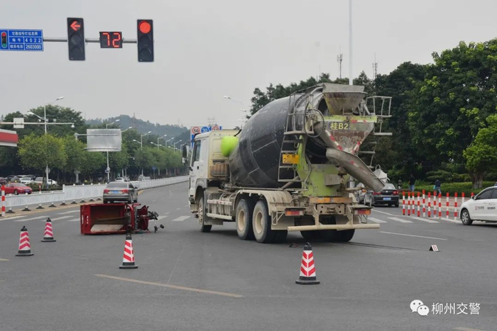 柳州市柳太路潭中西路交叉路口,一辆车牌为桂B22***的水泥罐车右转途中没有注意到正在直行的电动三轮车,并与其相撞,三轮车被撞倒。