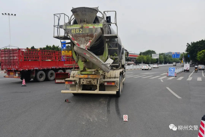柳州市公安局交警支队柳南大队民警接到警情后立即抵达现场,水泥罐车车头左侧有刮擦痕迹,三轮车横躺在水泥罐车左前方,路面上有明显的刹车和刮擦痕迹。
