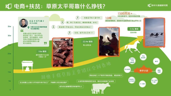 成为快手达人以来,他在家乡建立了占地510平米的牛肉干加工厂,雇佣12名当地贫困户,并通过记录草原美景和牧民生活,推动当地旅游业发展,2020年疫情期间太平哥通过快手直播帮老乡卖出滞销土豆10吨。2018年至今,他在快手的交易额已超过1500万元。