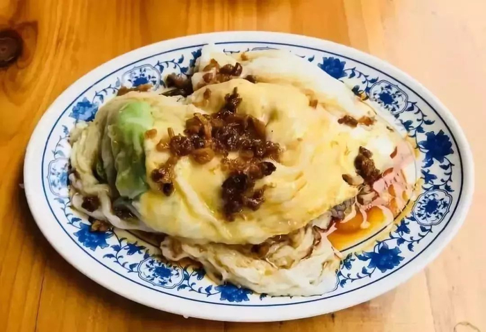 一张面粉皮,打上一个蛋,加猪肉碎,加萝卜丁,加香菇丝,加切碎的白菜片或豆芽或笋丁,然后上面浇一层芝麻浆和卤汤。